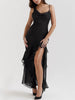 Wir präsentieren unser schwarzes Maxikleid mit Rüschen. Ein zeitloses Stück, das Eleganz und Stil mühelos vereint. Dieses Kleid verleiht Ihnen Selbstvertrauen. Mit einer schmeichelhaften Silhouette und dramatischen Rüschendetails.
