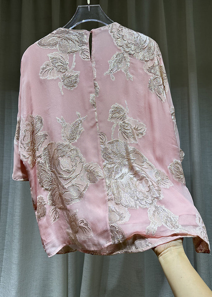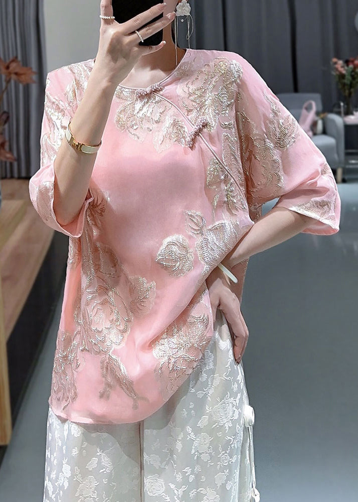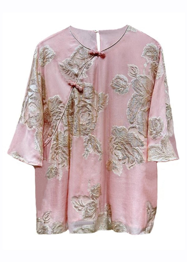 Chic Rosa O-Ausschnitt Bestickte Knopf Seidenhemden Armband Ärmel