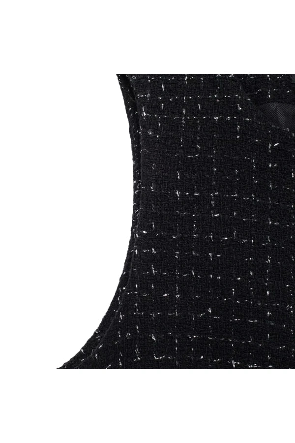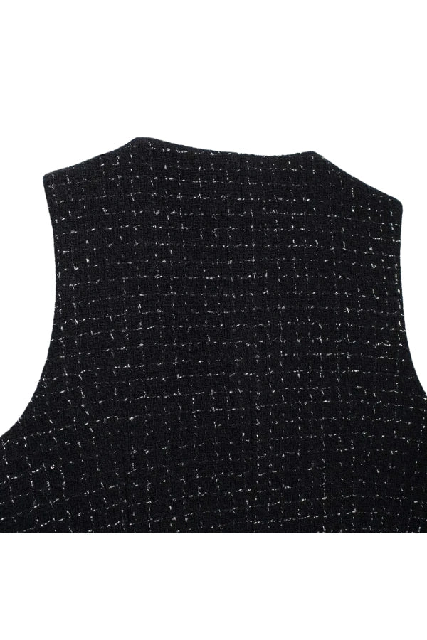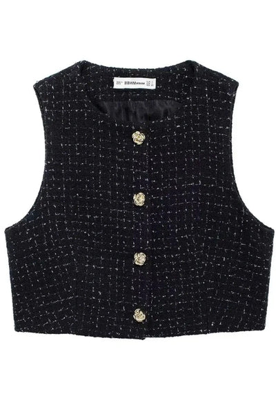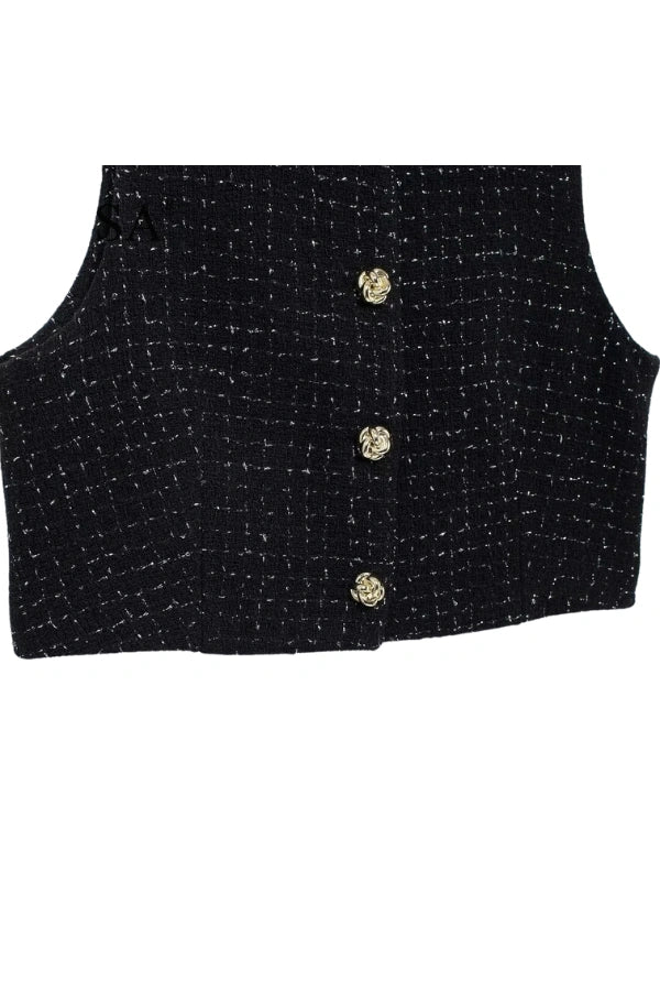 Werten Sie Ihre Garderobe mit dieser strukturierten, kurzen Weste auf. Eine perfekte Balance aus Eleganz und modernem Flair. Mit einem eleganten Rundhalsausschnitt und ärmellosem Design ist diese Weste mit metallischen Fäden für einen dezenten Schimmer akzentuiert und mit geprägten Goldknöpfen für einen Hauch von Luxus versehen. Ihre kurze Silhouette macht sie ideal zum Tragen über Kleidern, Blusen oder maßgeschneiderten Hosen und verleiht jedem Outfit eine elegante und zugleich moderne Note. Perfekt für tagsüber und abends. Dieses vielseitige Oberbekleidungsstück ist ein Must-have für stilbewusste, selbstbewusste Frauen.