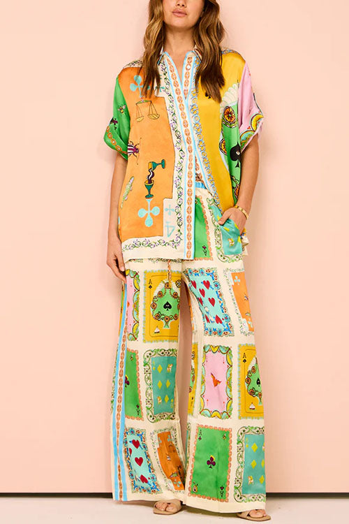 Transform your wardrobe with our Meridress Unique Print Satin Set. Feel confident in the eye-catching print. flattering short sleeves. and versatile button-down shirt. The flattering waist and flowy wide leg pants complete the look for a bold and stylish statement.