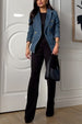 Erleben Sie Stil und Raffinesse mit unserem zweireihigen Denim-Blazer mit Reverskragen. Der klassische Reverskragen und das zweireihige Design verleihen einen Hauch von Eleganz, während der Denim-Stoff für eine bequeme Passform sorgt. Perfekt für einen eleganten und modischen Look.