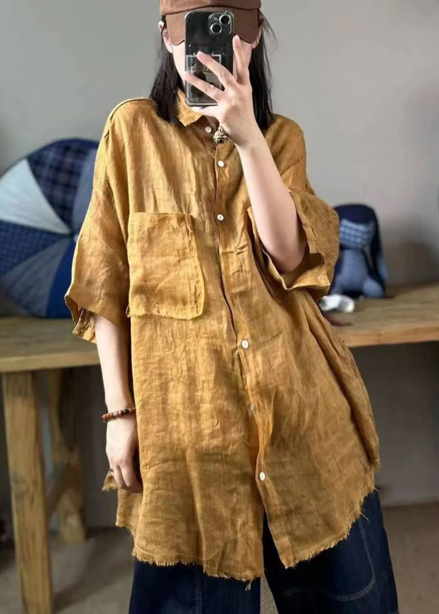 Plus Size Damen Grünes Peter Pan Kragen Leinenhemd Tops Halbarm