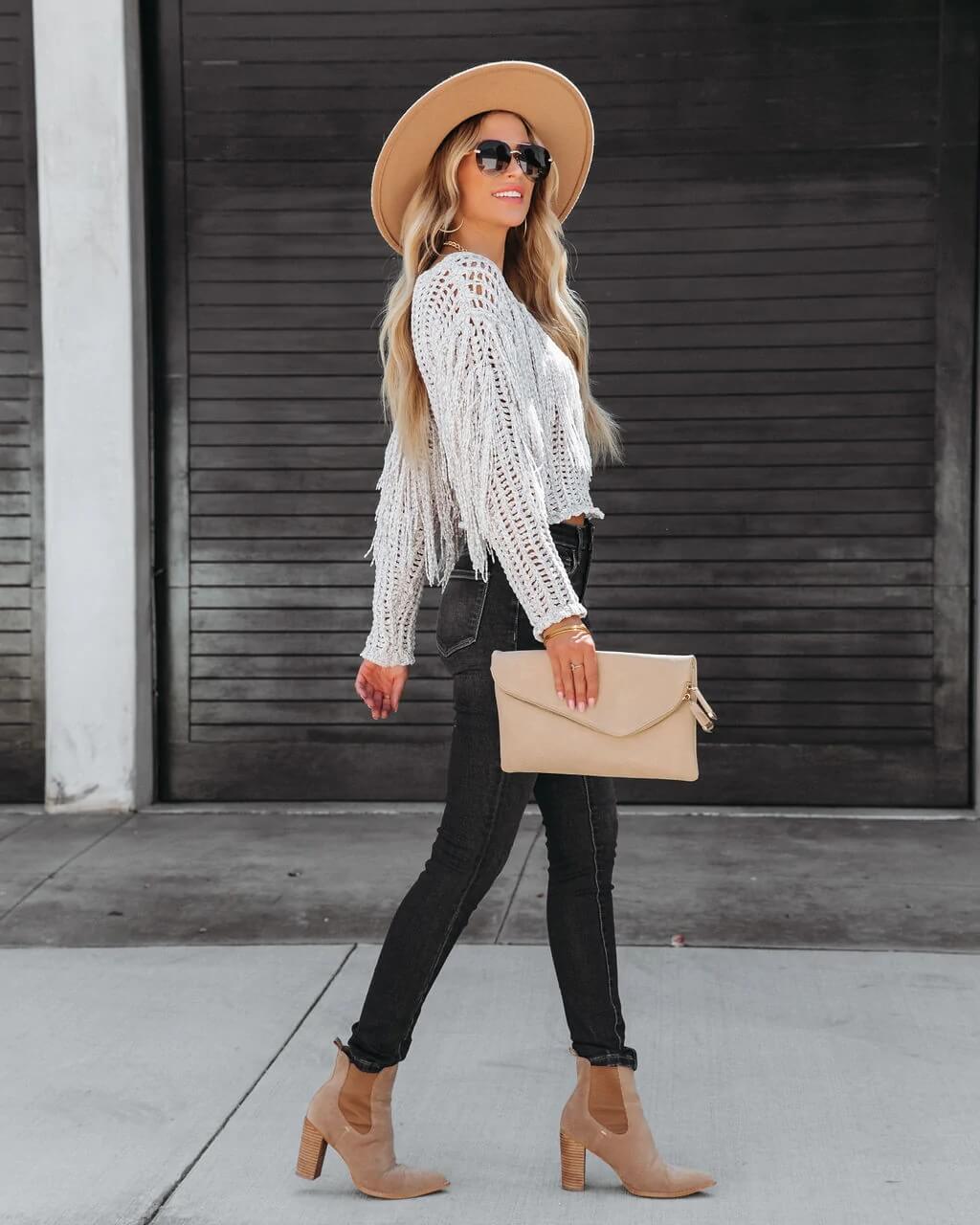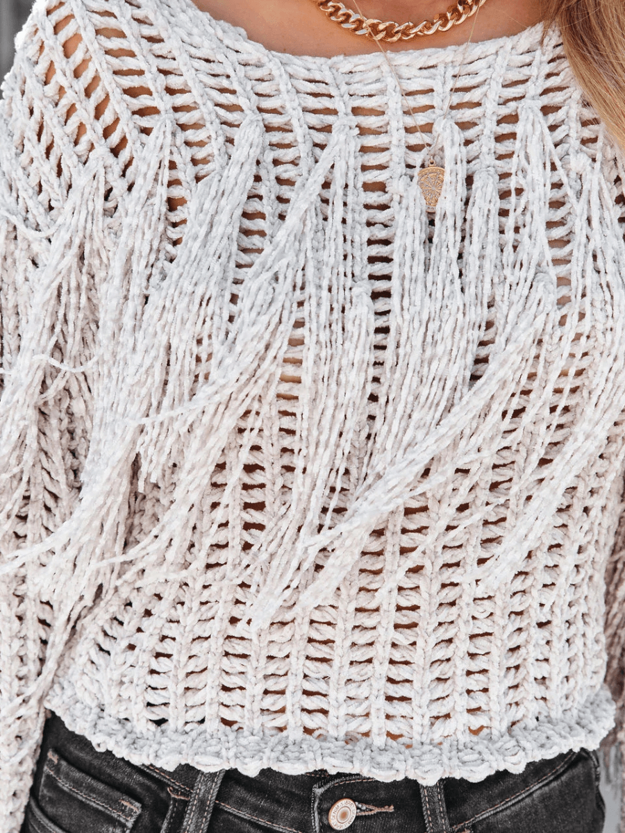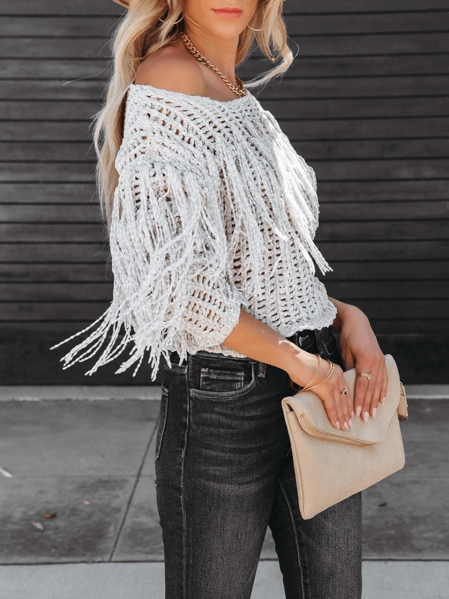 Veredeln Sie Ihren Stil mit dem Ramy Crochet Fringe Sleeves Cover Up Top! Dieses perfekte Stück besticht durch auffällige Häkelakzente und kantige Fransenärmel, die Sie hervorstechen lassen und für Aufsehen sorgen. Zeigen Sie Ihren einzigartigen Stil mit diesem einzigartigen Top (und vielleicht sogar Ihre eigene kleine Note)!
