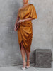 Asymmetrisches Design: Das Highlight dieses Kleides ist seine asymmetrische Silhouette mit einem langen Ärmel und einem drapierten, unregelmäßigen Saum.