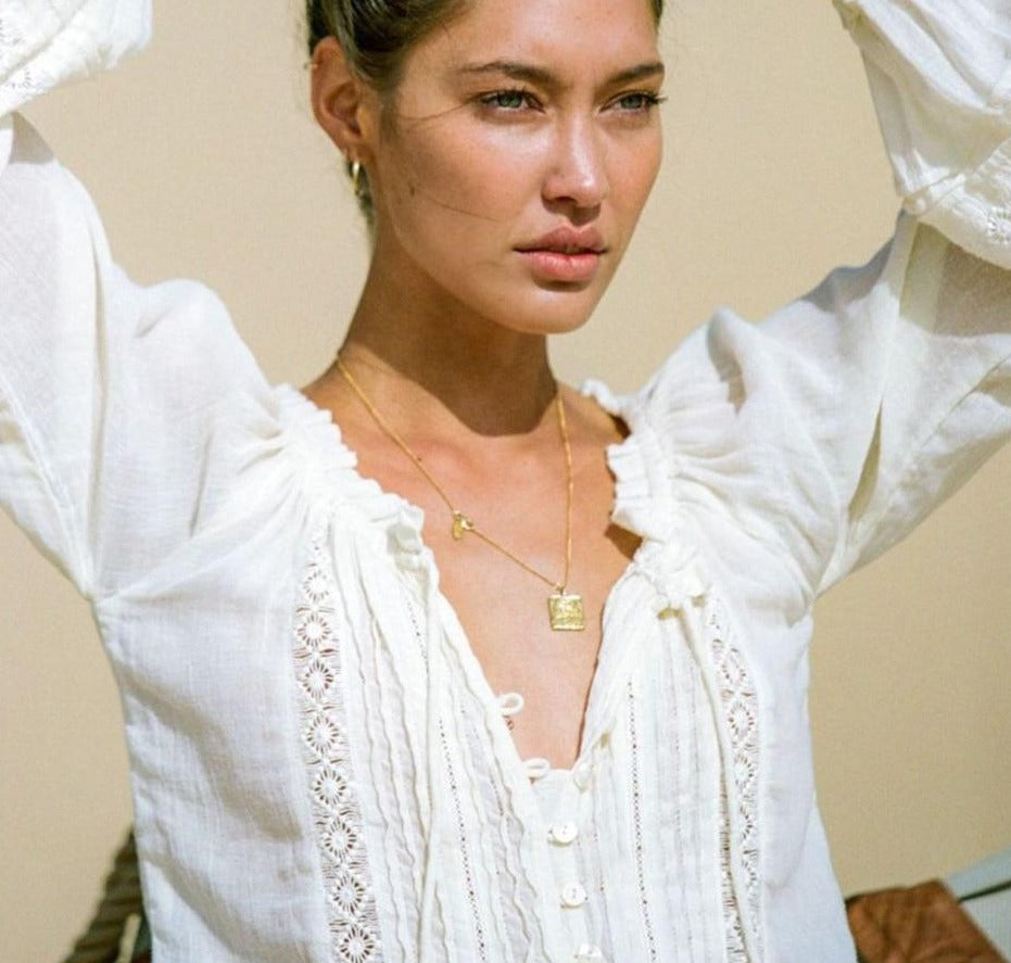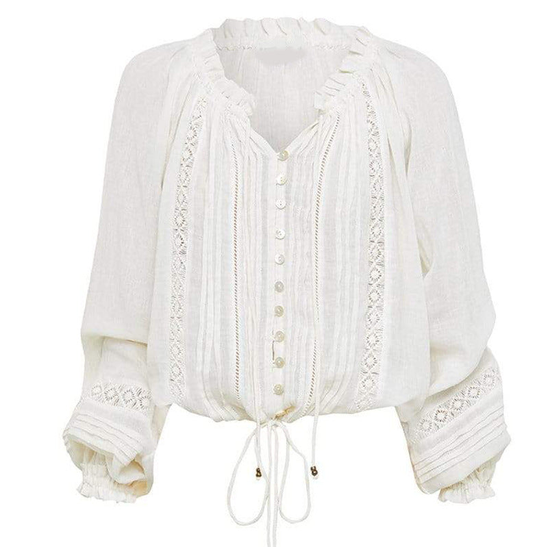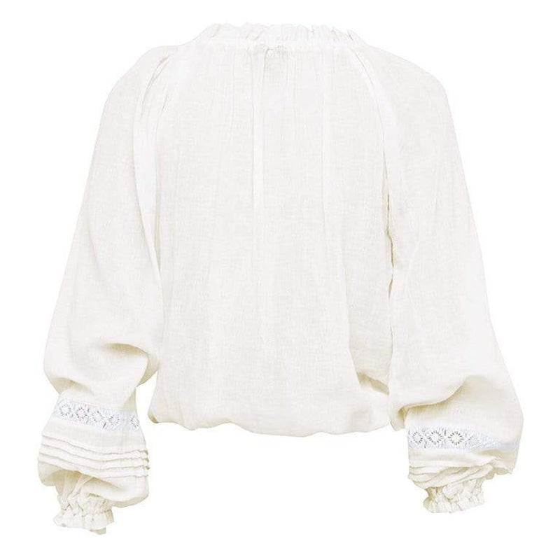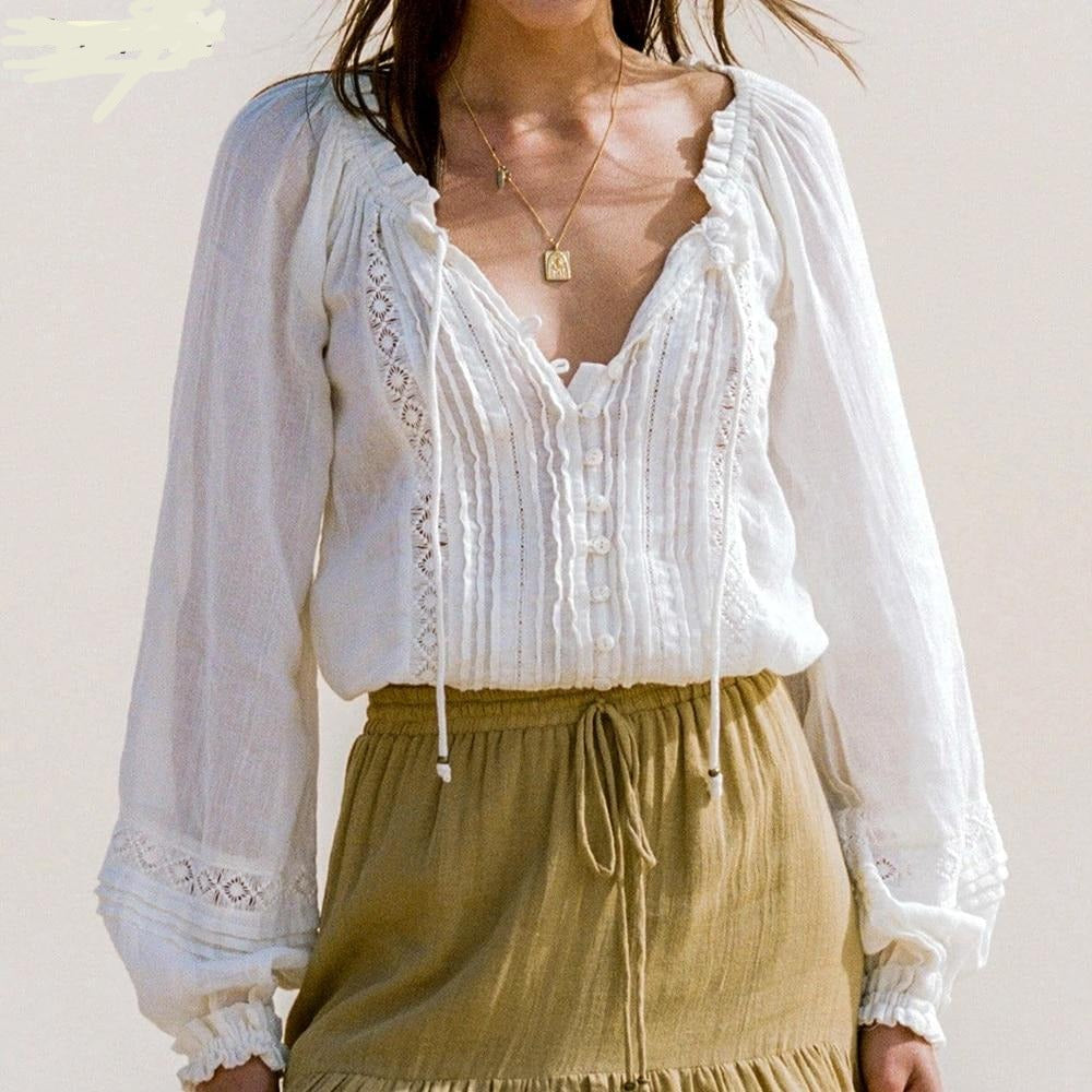 Los frunces del escote de nuestra blusa Assande realzan tu rostro. Tiene una caída preciosa y un lazo que se puede dejar abierto, ideal para combinar con collares.