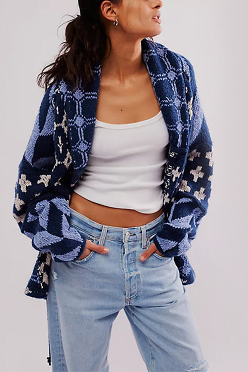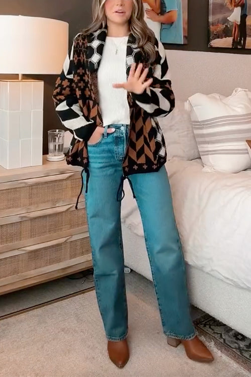 Mejora tu estilo con nuestro cárdigan con estampado geométrico y botones en el dobladillo con cordón. Su original estampado geométrico le da un toque moderno. Además, el diseño con botones y el dobladillo con cordón permiten un ajuste personalizado. Siéntete abrigada y a la moda con esta prenda imprescindible para tu armario de invierno.