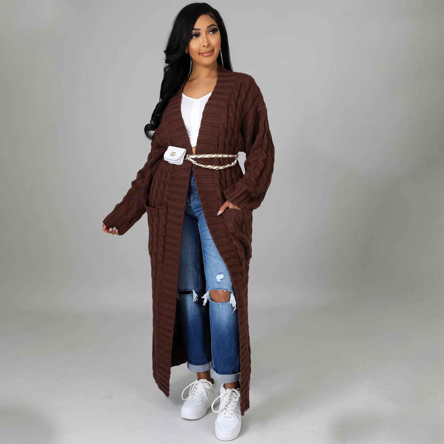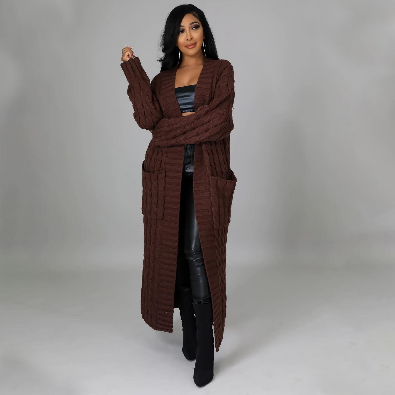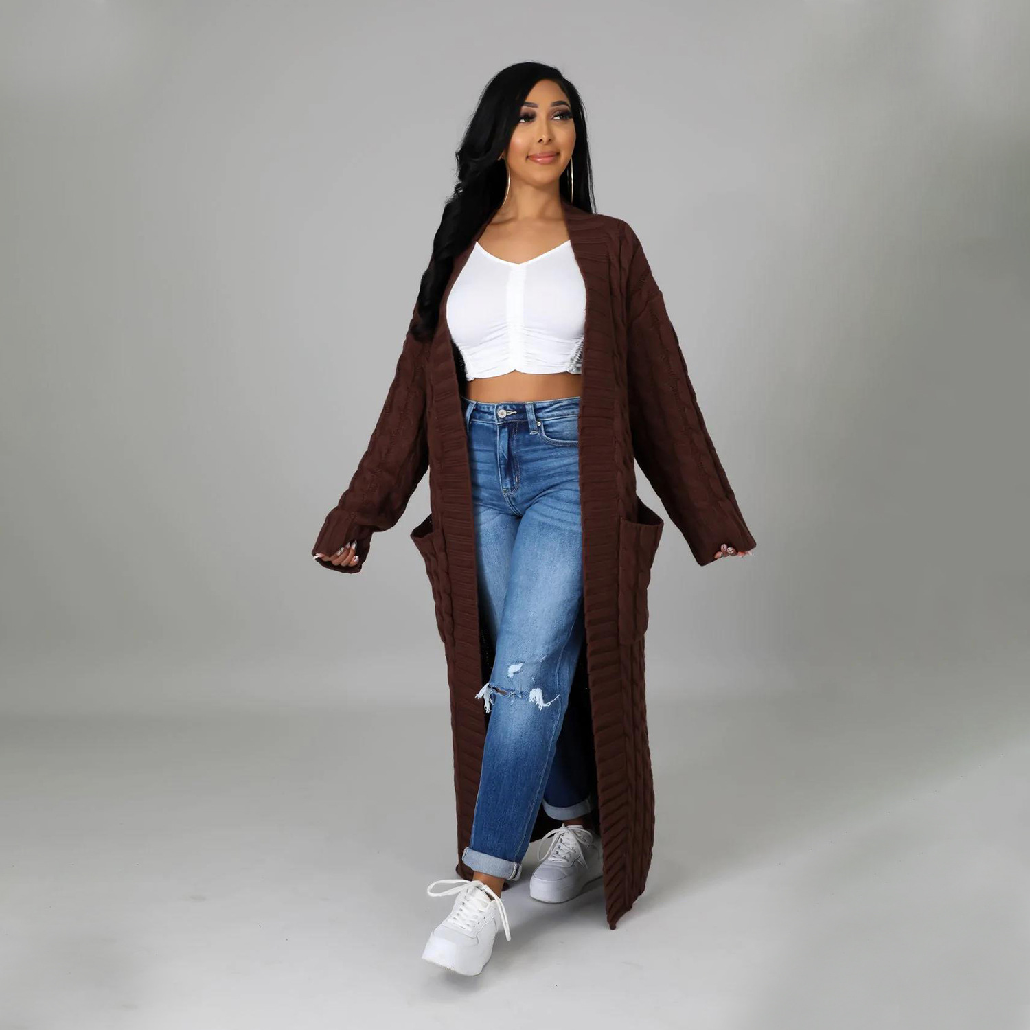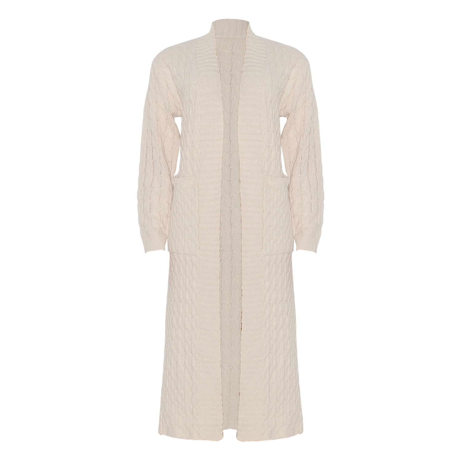 Este cárdigan informal presenta un tejido de jersey liso y un corte regular. El largo de la parte superior es más largo y el diseño incluye mangas largas. Está confeccionado con una mezcla de poliéster y diseñado para otoño e invierno. No incluye el tipo de cierre.