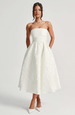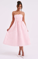 Confeccionado en lujoso tejido jacquard, este vestido presenta un intrincado estampado floral que aporta profundidad y textura al diseño. El escote halter enmarca elegantemente los hombros y realza el escote, mientras que el corpiño ajustado acentúa la cintura, creando una silueta favorecedora.