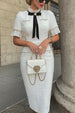 Un vestido de tweed increíblemente hermoso con mangas pequeñas, adornado con pliegues y encaje bordado con perlas, con bolsillos de parche y un lindo lazo de terciopelo extraíble. Perfecto para un evento especial o para una reunión de negocios.