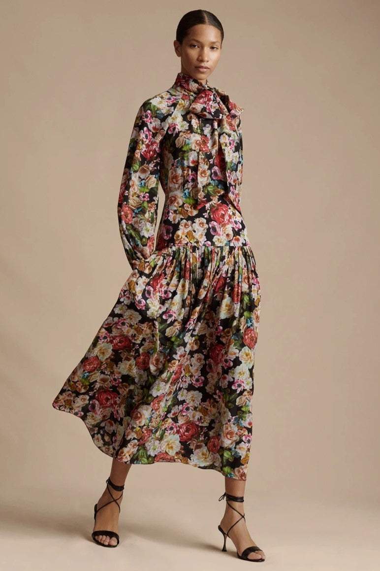 - Vestido midi floral fruncido, elástico, con aberturas, con capas y volantes.