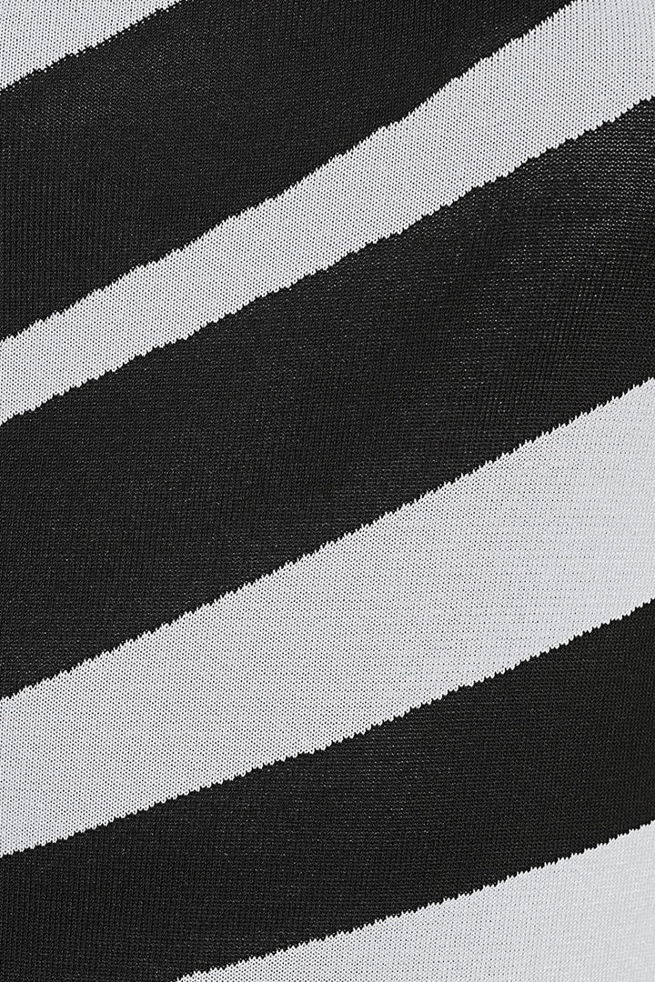 Patrón de rayas multidireccionales. Un solo hombro. Hombreras. Abertura lateral. Bajo recto. Largo maxi.