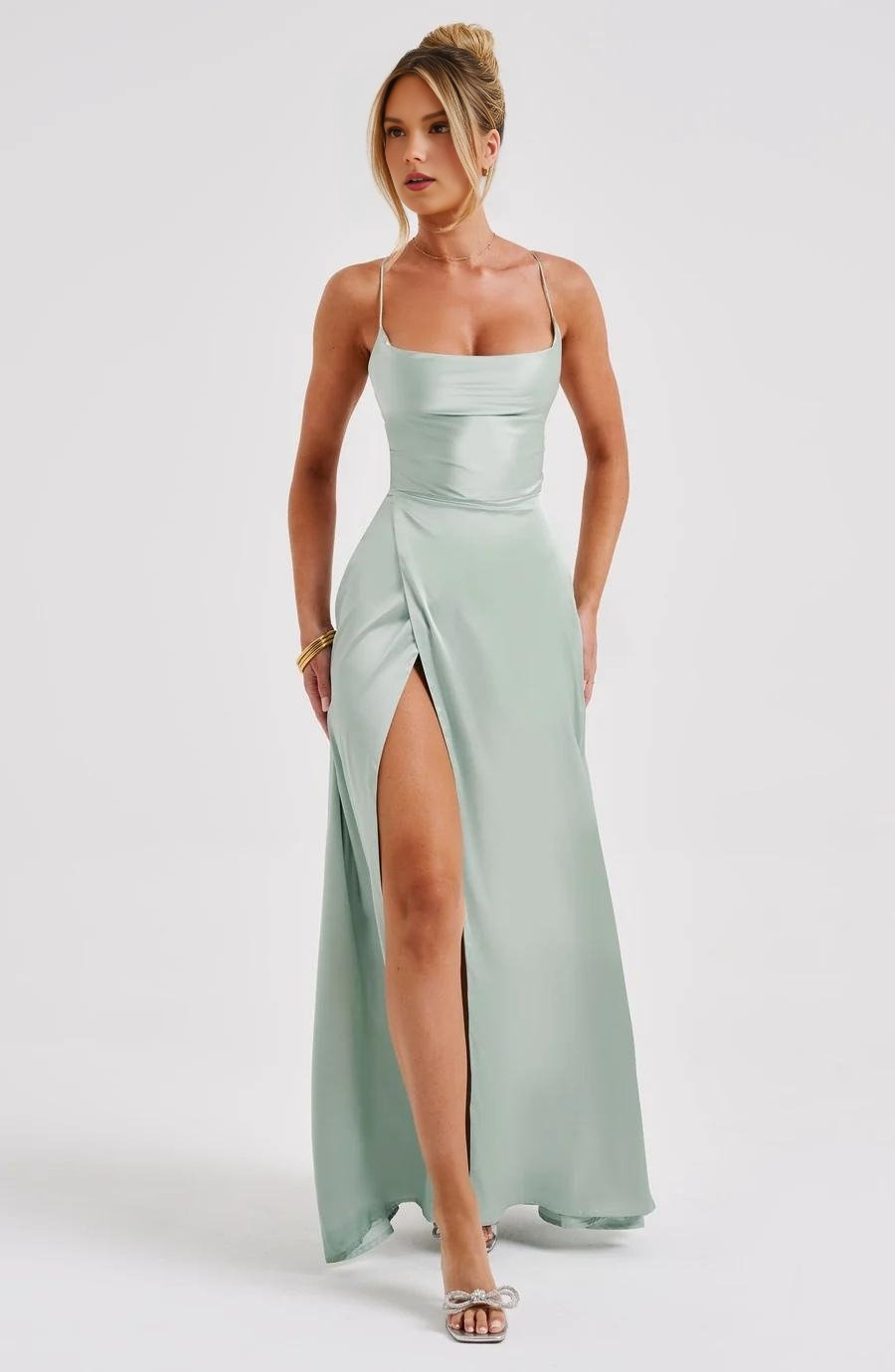 Atrae todas las miradas con el vestido Lagoon, una hermosa combinación de sensualidad y gracia. Este elegante vestido de satén se adapta perfectamente a tu figura. Su escote desbocado y finos tirantes finos le dan un toque delicado y femenino. La abertura alta le da un toque atrevido, permitiendo tanto movimiento como una silueta impactante.