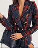Nuestro elegante blazer Lucia de cuadros presenta cuello vuelto. Doble botonadura. Botones dorados en el centro delantero. Diseño a cuadros. Completa el look con elegantes vaqueros y pantalones, botas y zapatillas.