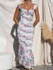 El vestido luce un estampado espectacular que le da un toque único y cautivador a tu conjunto. Ya sea una boda en un jardín, una gala o una cena elegante, serás el centro de atención.