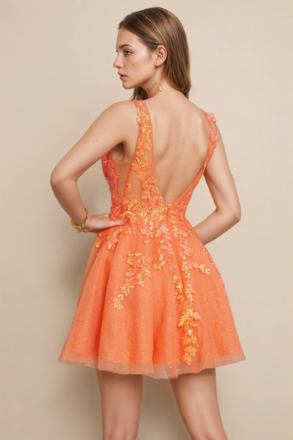 Shine bright at your special event in this glitter homecoming dress! The orange homecoming dress features a flattering A-line silhouette. covered in eye-catching glitter and sequins that sparkle with every move. Perfect for homecoming. prom. or any festive occasion. this dress combines vibrant color with elegant design. Lightweight and comfortable. it ensures you dance the night away in style while turning heads.