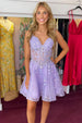 Introducing our Lilac Homecoming Dress. featuring a cute and pretty short design with a flattering V-neckline and lace details. Perfect for any special occasion. this pretty homecoming dress exudes elegance and charm. making you stand out from the crowd. Elevate your prom night or special event with this stunning and on-trend dress.