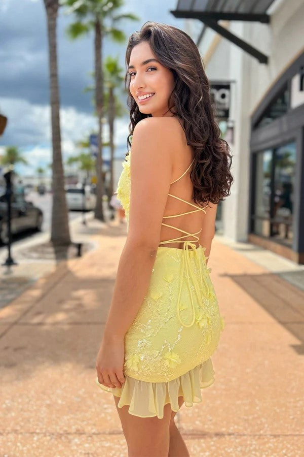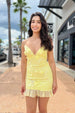 This bodycon yellow homecoming dress features a vibrant yellow color adorned with delicate floral patterns. designed to highlight your silhouette with a flattering V-neckline. Perfect for making a confident statement at your party. it combines style and comfort to keep you feeling supported and stunning all night long.