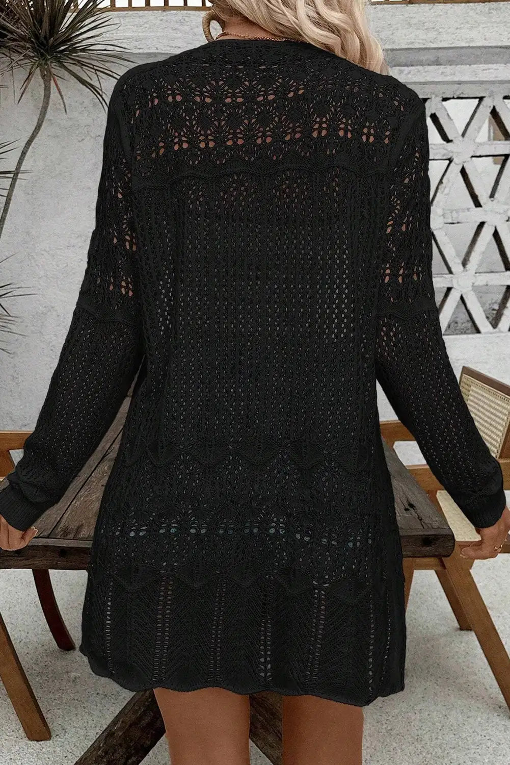 Add a touch of elegance to your outfit with our Chic Black Crochet Hollow Out Open Front Cardigan. The exquisite crochet detailing and chic hollow out design create a stylish look perfect for any occasion. Effortlessly layer with versatile options and elevate your style with this summer knit piece. Available in a range of solid colors to suit any outfit. this cardigan is a must-have for every fashion-forward individual. Elevate your wardrobe with our Southern Belle style cardigans and enjoy the comfort of 100% acrylic material. Embrace the versatility and style of this casual and chic cardigan today!