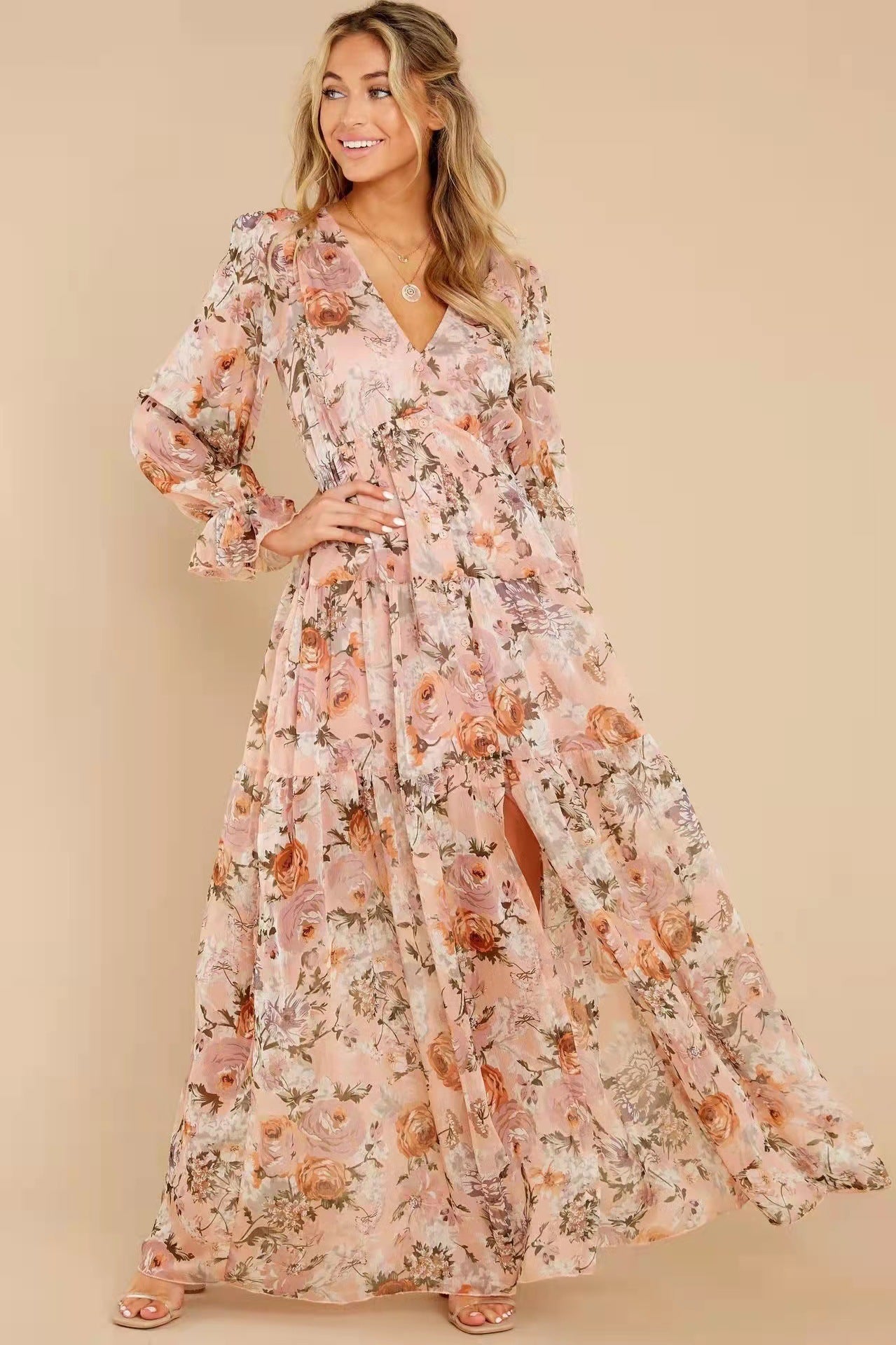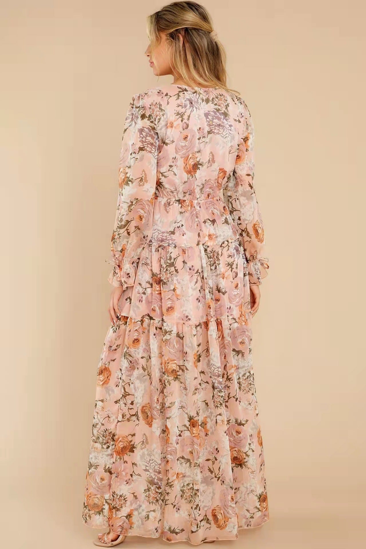 This stunning dress is the perfect addition to your wardrobe for any occasion. The soft. flowing material is adorned with a beautiful floral pattern that will have you feeling and looking your best. The long sleeves provide coverage while still being breathable. making it a great option for all seasons.