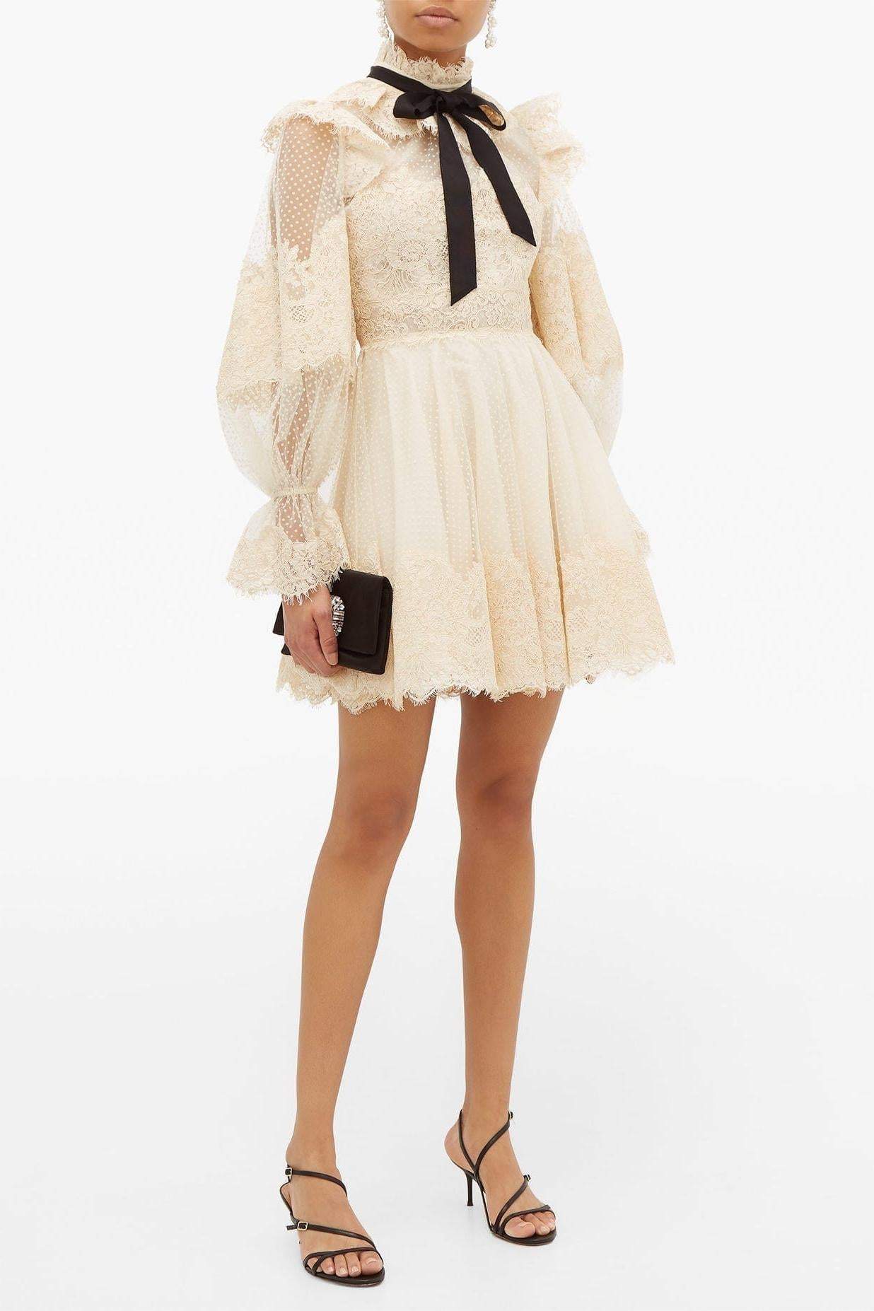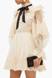 This dress has lantern sleeves that are wide at the shoulders and narrow at the wrists. creating a puffy effect. It also has a pussy-bow design that is a long. floppy bow tied around the neck. resembling a scarf. It can be matched with different accessories. such as heels. earrings. or clutches. to create a feminine and sophisticated look.
