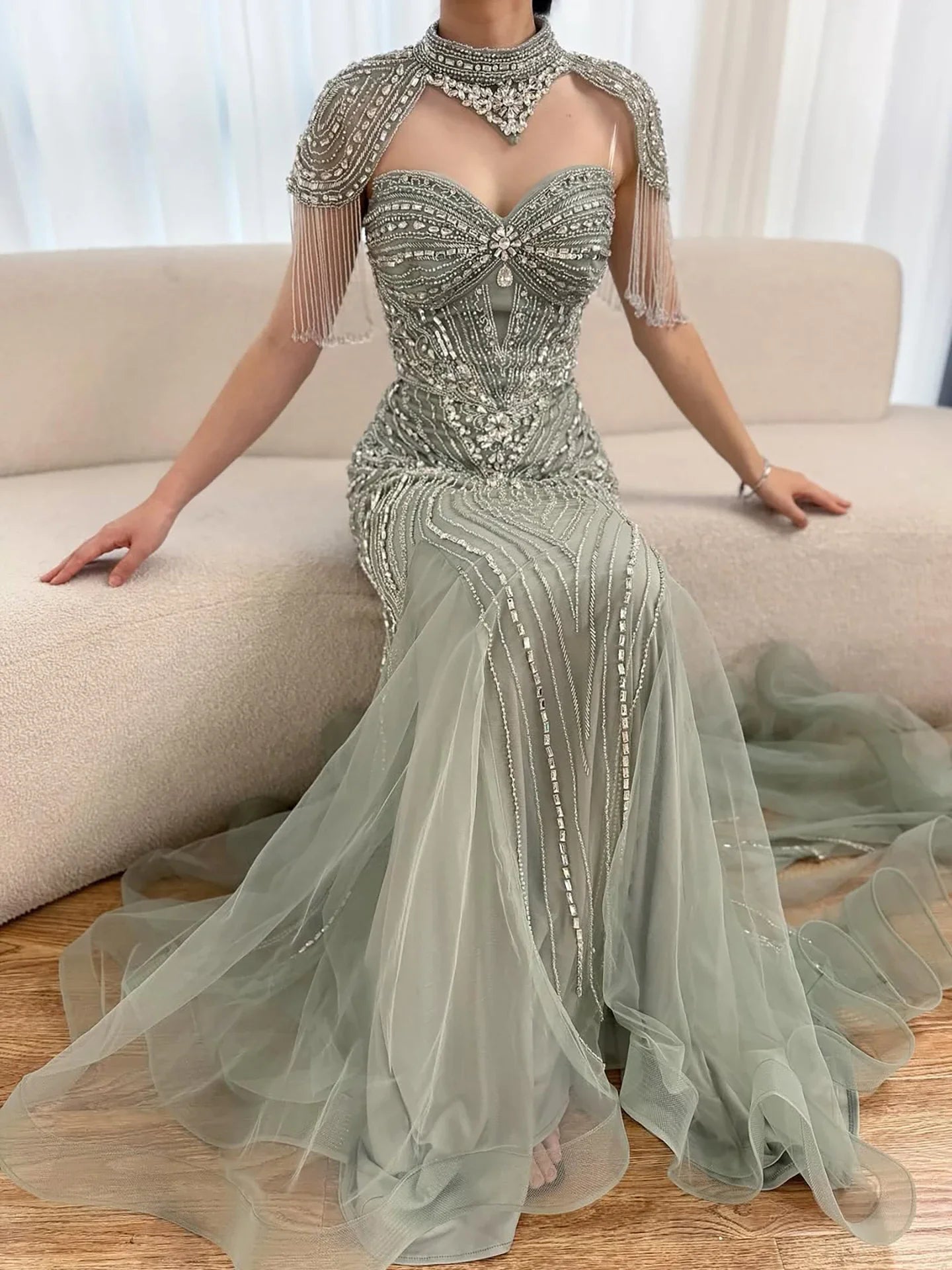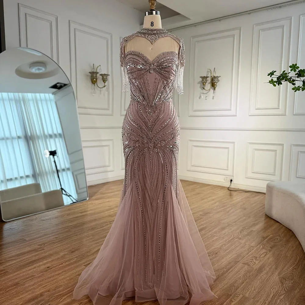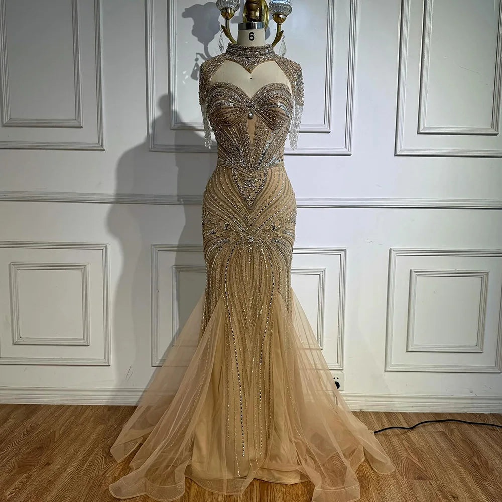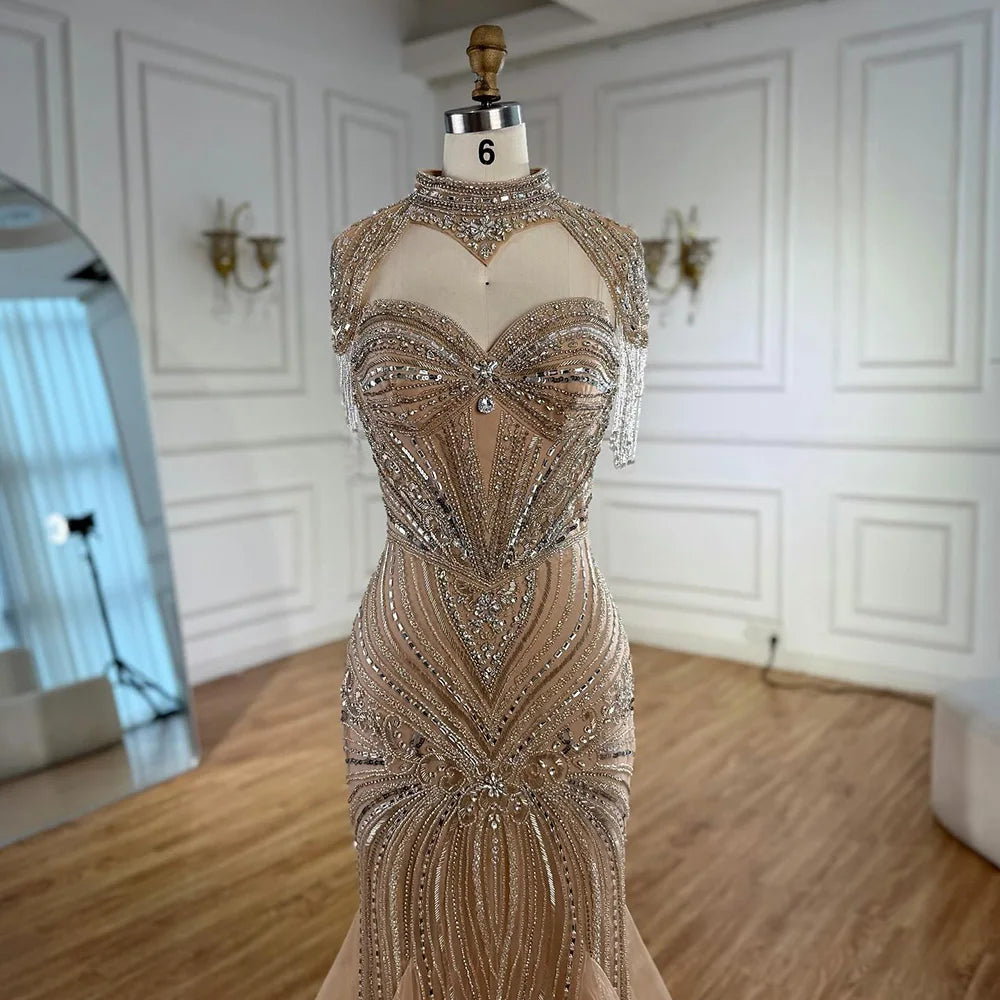 Elegant nude high neck mermaid evening gown featuring intricate beading and shoulder tassel chains. A standout Saudi-inspired design for formal occasions.
