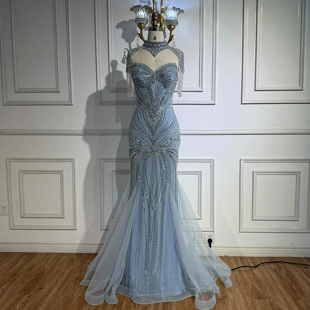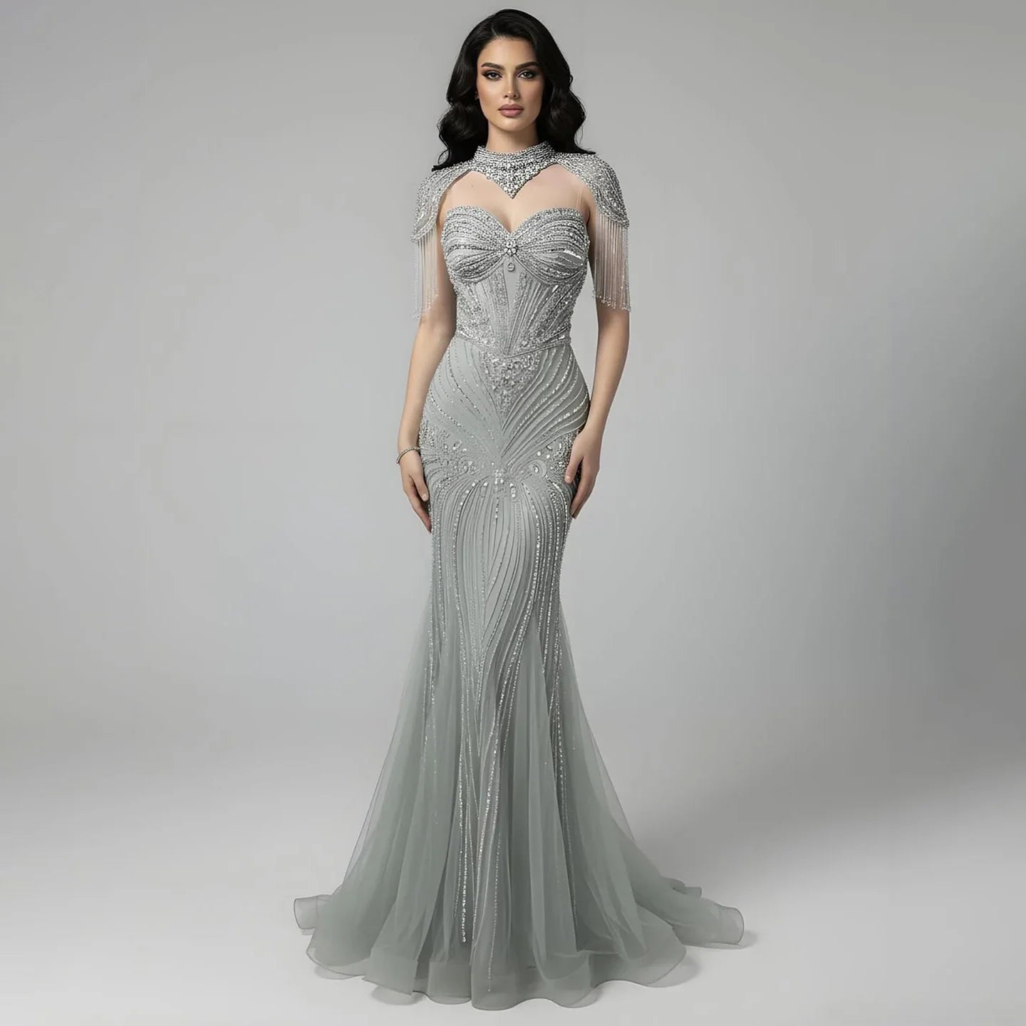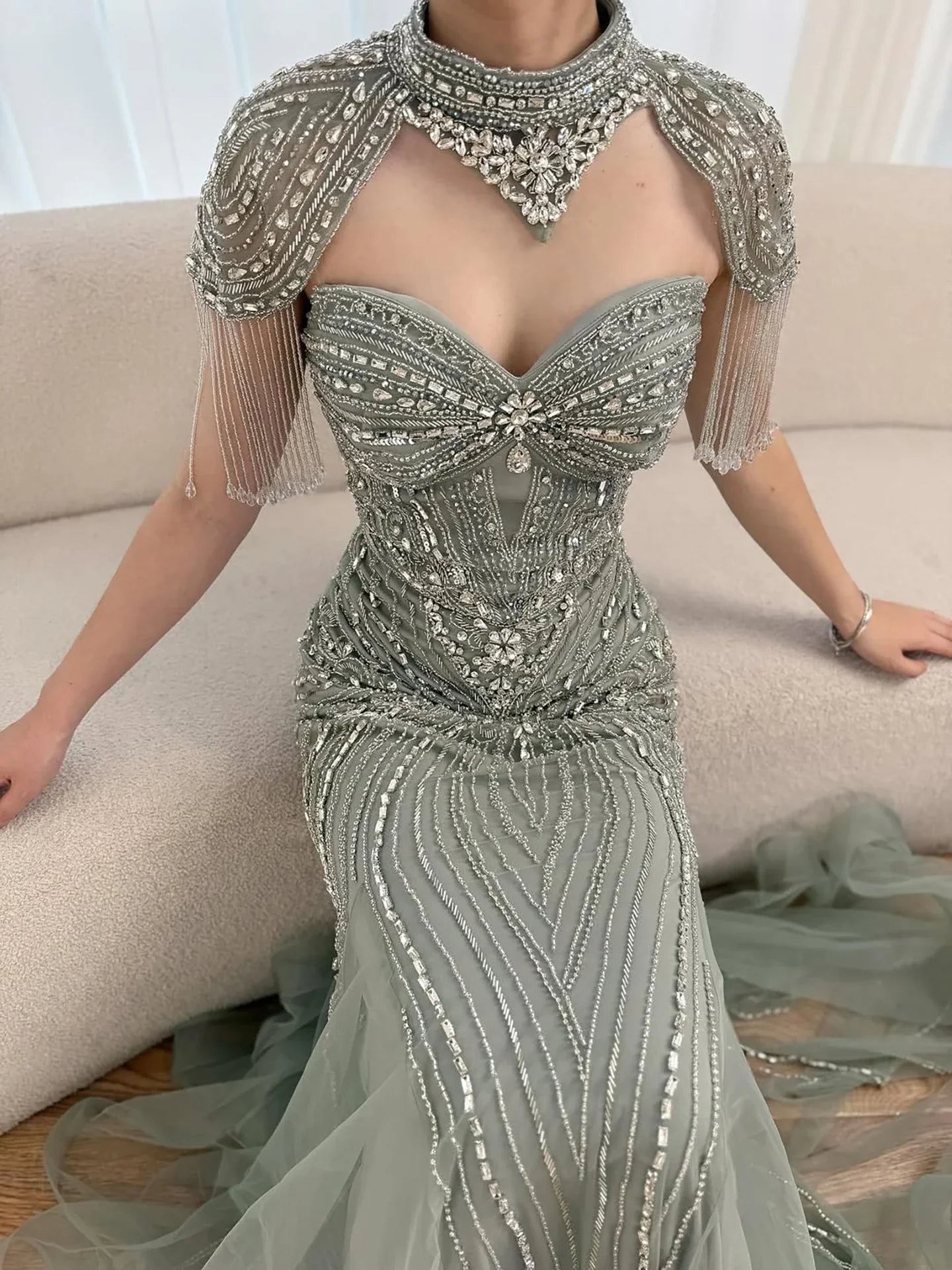 Elegant nude high neck mermaid evening gown featuring intricate beading and shoulder tassel chains. A standout Saudi-inspired design for formal occasions.