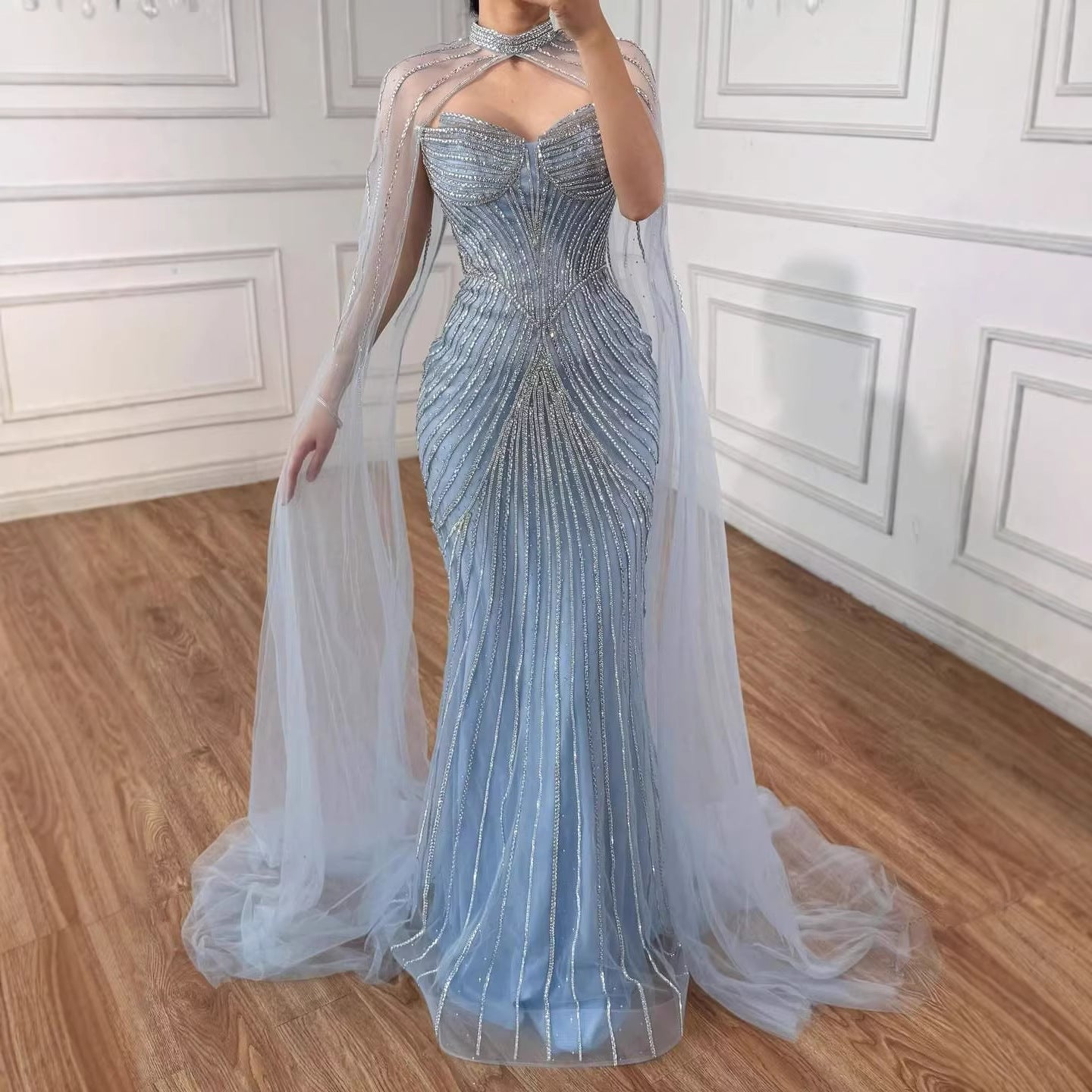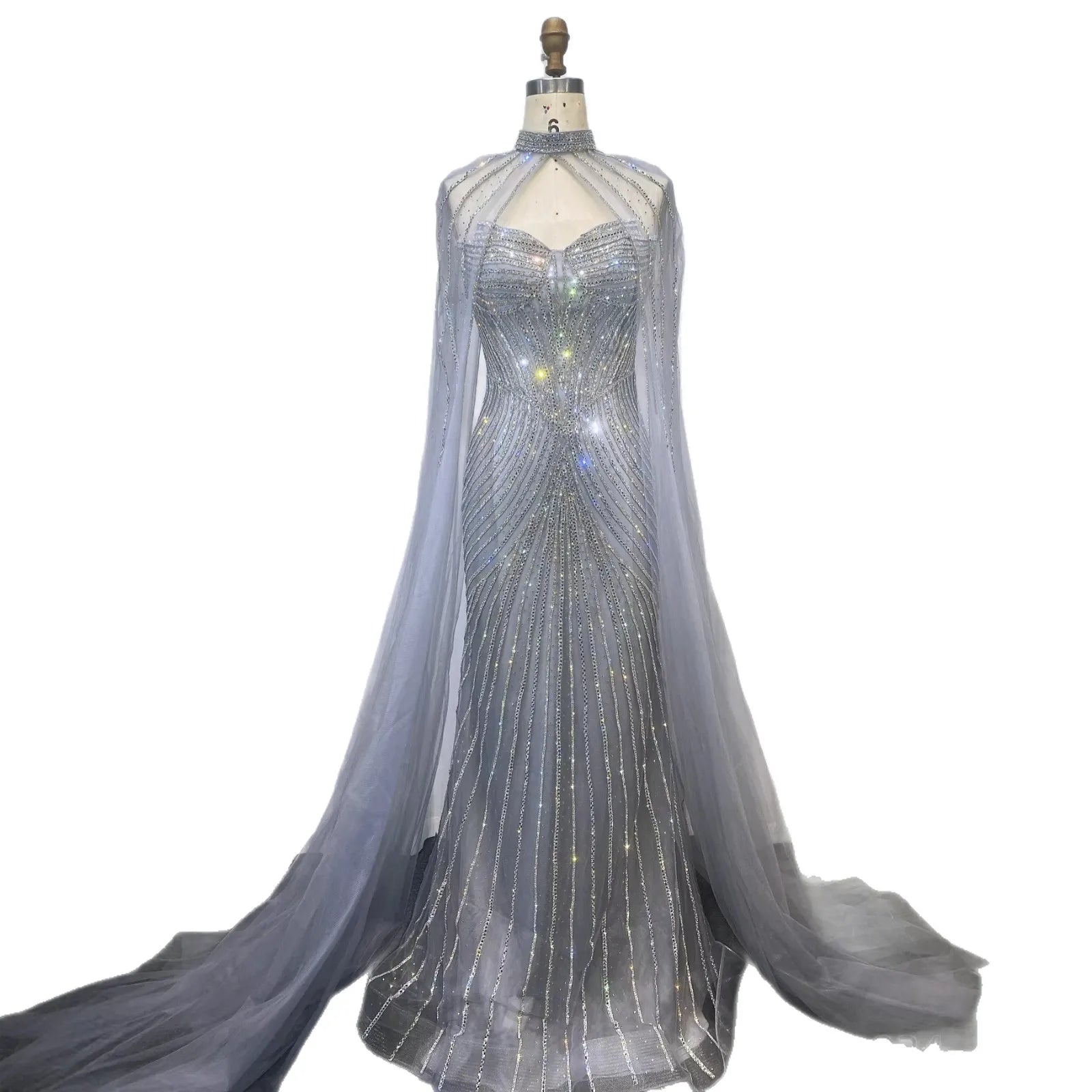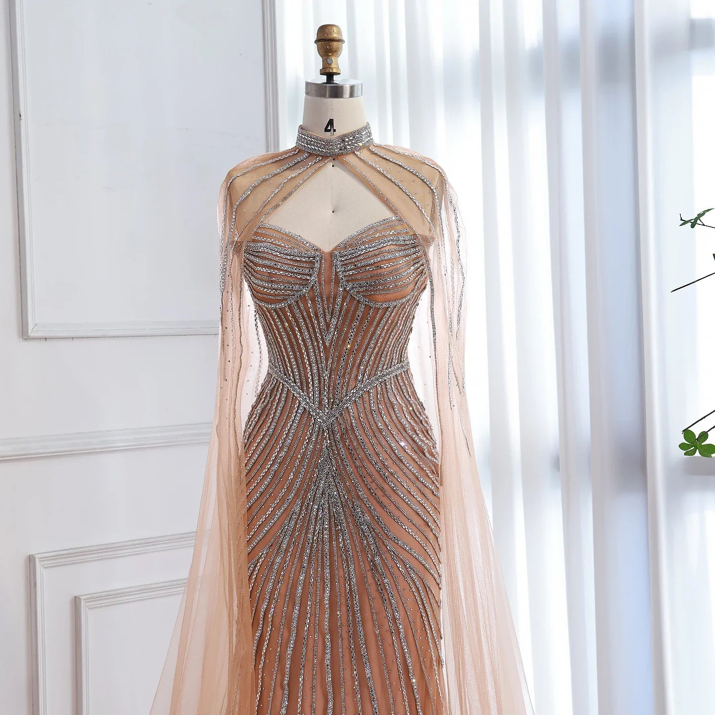 Elegant luxury nude mermaid evening dress with beaded details and cape sleeves. perfect for formal parties and special occasions.