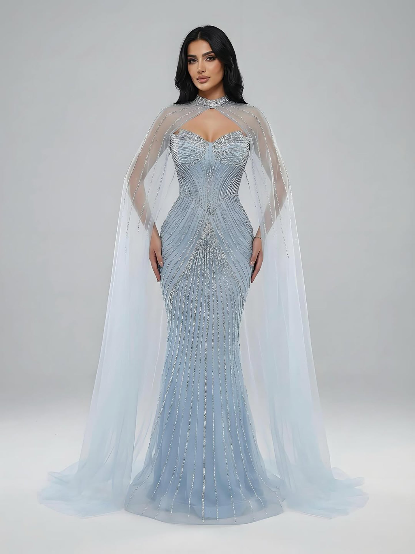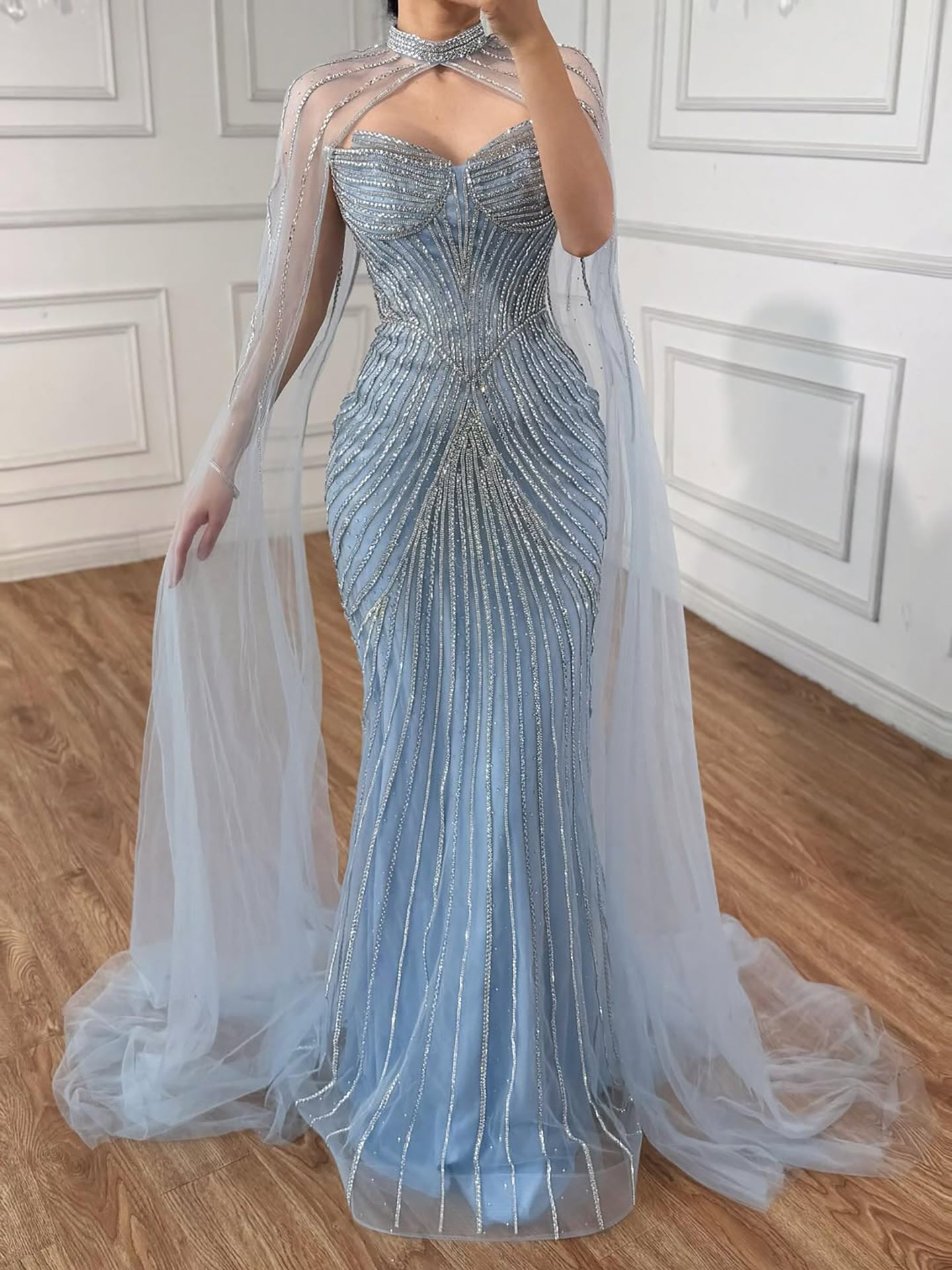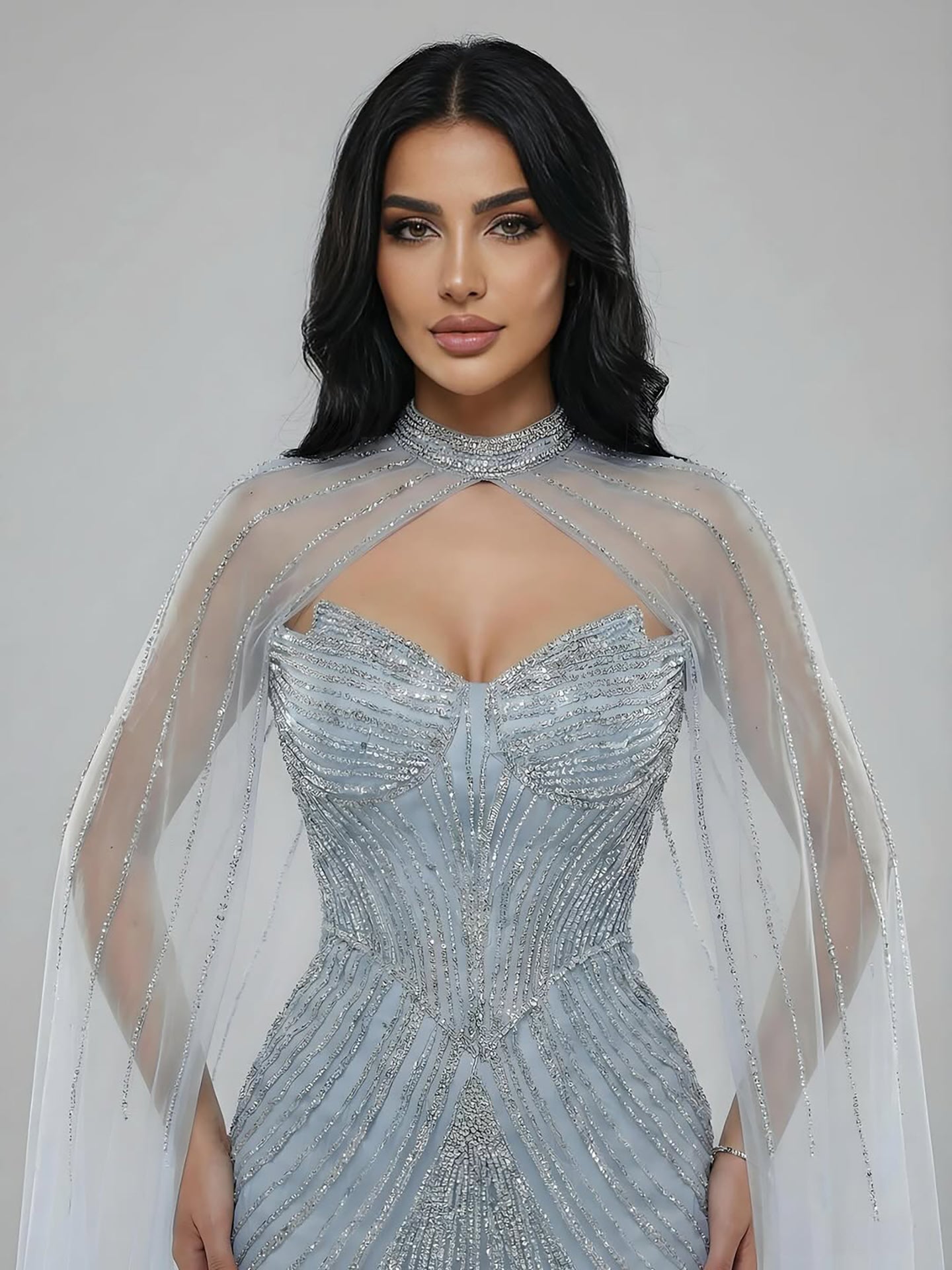 Elegant luxury nude mermaid evening dress with beaded details and cape sleeves. perfect for formal parties and special occasions.