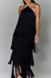 Introducing the ultimate statement piece for any party! The Meridress Chicest Halter Ruffle Layered Fringe Maxi Party Dress exudes confidence and elegance. With its chic halter neckline. stunning ruffle and fringe layers. and flattering maxi length. this dress is sure to turn heads and make you feel like a star. Be the talk of the event in this stunning dress!