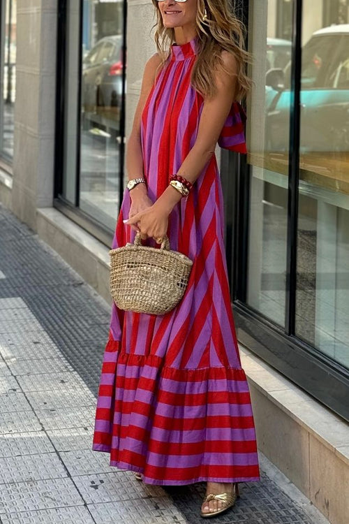 Upgrade your vacation wardrobe with our Meridress Halter Neck Open Back Striped Ruffle Maxi Vacation Dress. This dress features a flattering halter neck. an alluring open back. and stylish striped ruffle details. Be the envy of the beach and turn heads in this must-have dress for your next getaway.