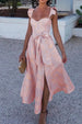 Look retro and fabulous in Meridress's Ruffled Shoulder Bow Knot Waist Slit Printed Vintage Party Dress. With a flattering waist knot and shoulder ruffles. this dress is sure to turn heads! Enjoy the pretty print and flowy skirt with delicate slits for a timeless look. Live your best life in this gorgeous dress!