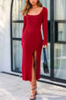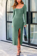 Fashion meets comfort in this beautiful square collar knit midi dress. With its bodycon silhouette and ribbed knit material. this dress is perfect for any occasion. The slit detail is the perfect finishing touch. adding a touch of style and class. Experience the elegance and comfort of the Meridress Square Collar Slit Ribbed Knit Bodycon Midi Dress.
