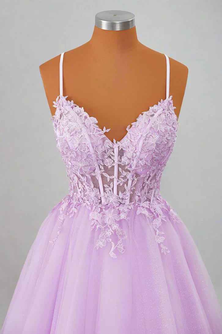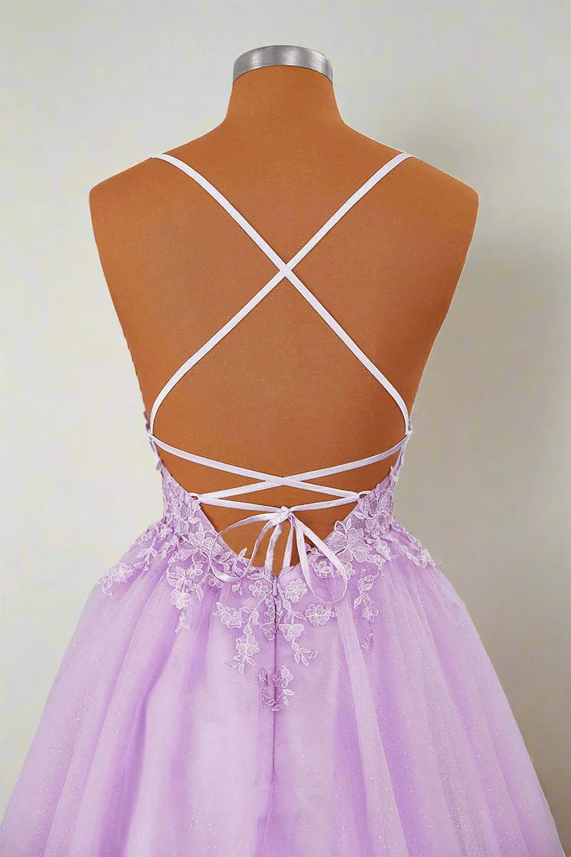 Feel like royalty in this enchanting lavender homecoming dress. designed with delicate princess straps and exquisite appliqué details. This princess homecoming dress features a dreamy pastel hue and elegant embellishments. creating a fairytale-worthy look for your special night. Perfect for dances. proms. or parties. this gown combines youthful charm with sophisticated style. ensuring you'll shine like true prom royalty!