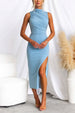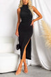 Look sharp and stay cool in this stylish. lightweight Sleeveless Mockneck Midi Bodycon Dress with its sultry side slits. Show off your beautiful curves and embrace the elegant simplicity of this timeless look. Add a touch of glamour to your wardrobe.