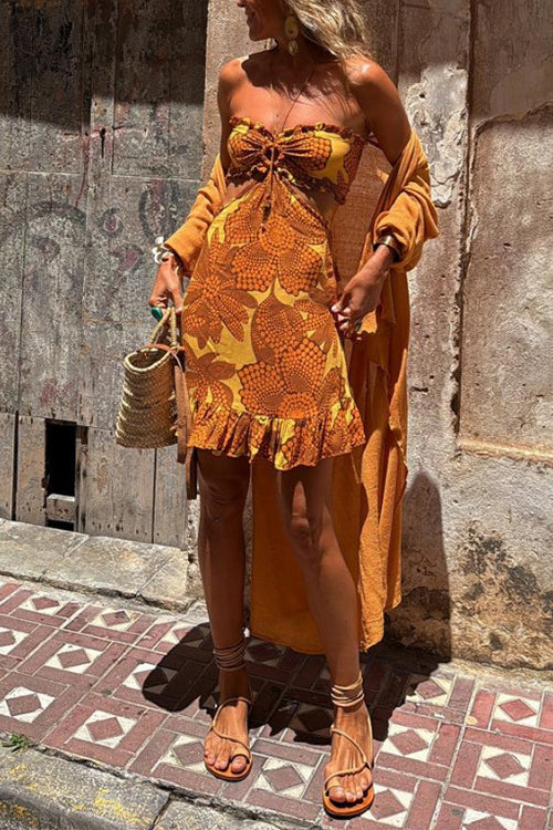 Flatter your curves in our Strapless Ruffle Trim Cut Out Waist Printed Mini Dress. The strapless design and cut out waist detail add a touch of flirty allure. while the ruffle trim and printed pattern elevate the look. Perfect for any occasion. this mini dress is a must-have for your wardrobe.
