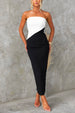 Enhance your style with our Strapless Tube Back Slit Color Block Bodycon Midi Dress. The strapless design and back slit add a touch of elegance while the bodycon fit flatters your figure. Perfect for any occasion. this dress is a must-have addition to your wardrobe.